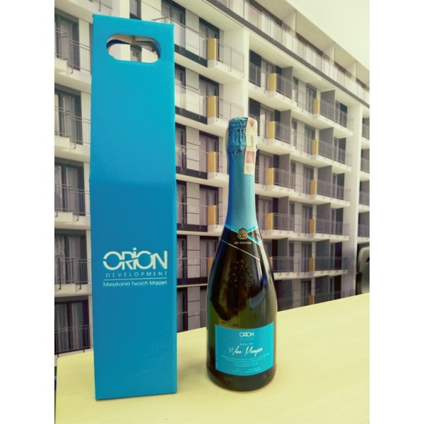 Zestaw z winem musującym, dedykowana etykieta i kartonikiem z okienkiem z laserowanym napisem