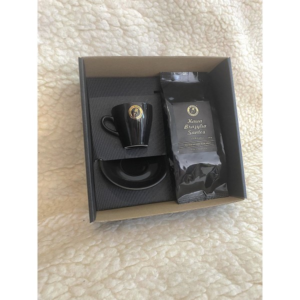 W zestawie podstawowym: - jedna elegancka czarna/ wewnatrz biała filiżanka z logo 80 ml z talerzykiem. Zestaw do Espresso.