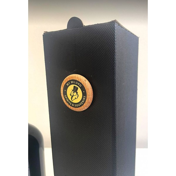 - Zaprojektowana etykieta z logo, najczęściej na złotej lub srebrnej folli pokrytej lakierem UV. Inne wersje.